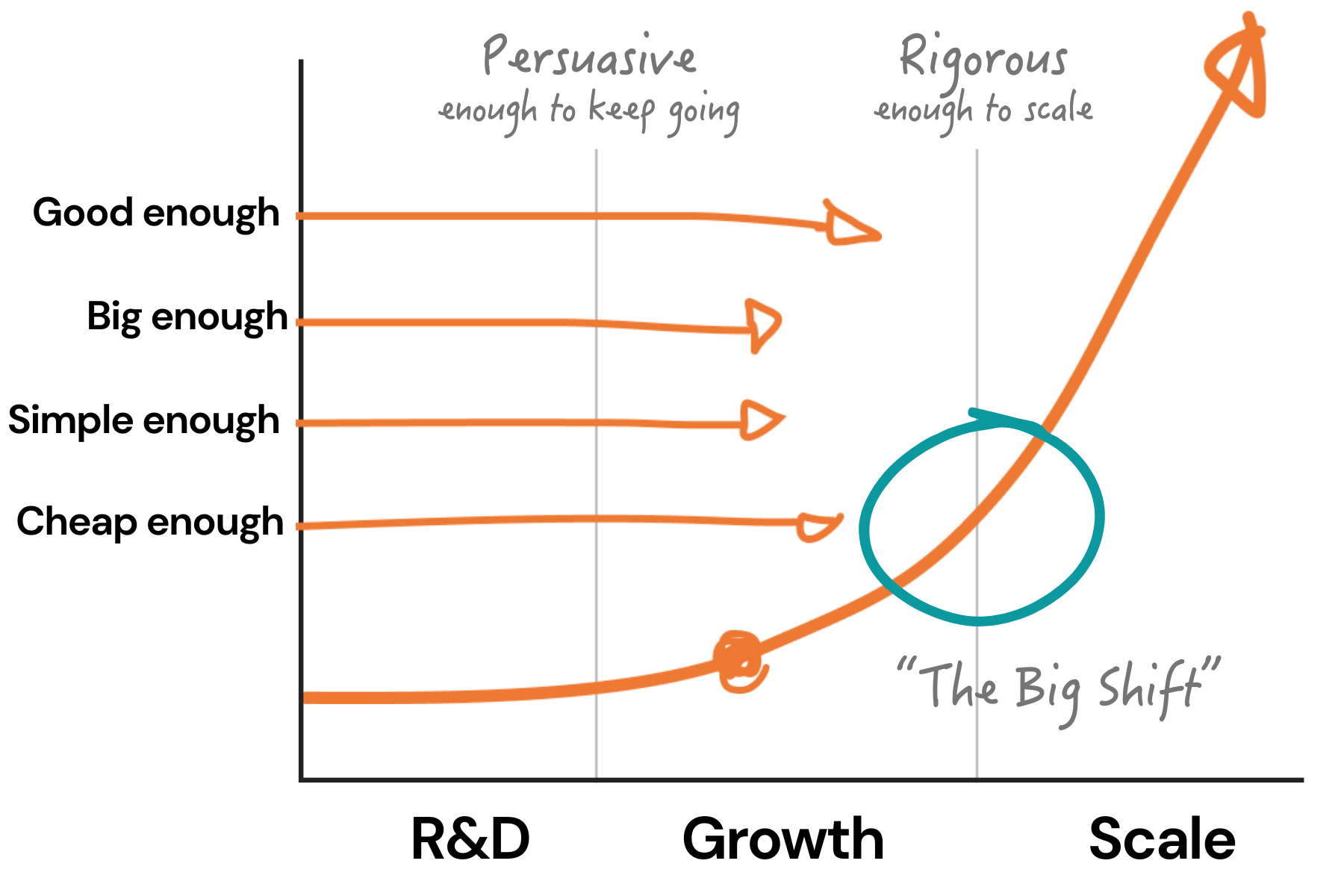 This simple graphic has proven a remarkable tool to track progress. The dot is where we think they are on the journey to scale, and the arrows track their progress on the “enoughs.” The first line means “persuasive enough to keep going;” the second is “proven enough to scale.” Where the dots and arrows land is a shared judgement with us and them.