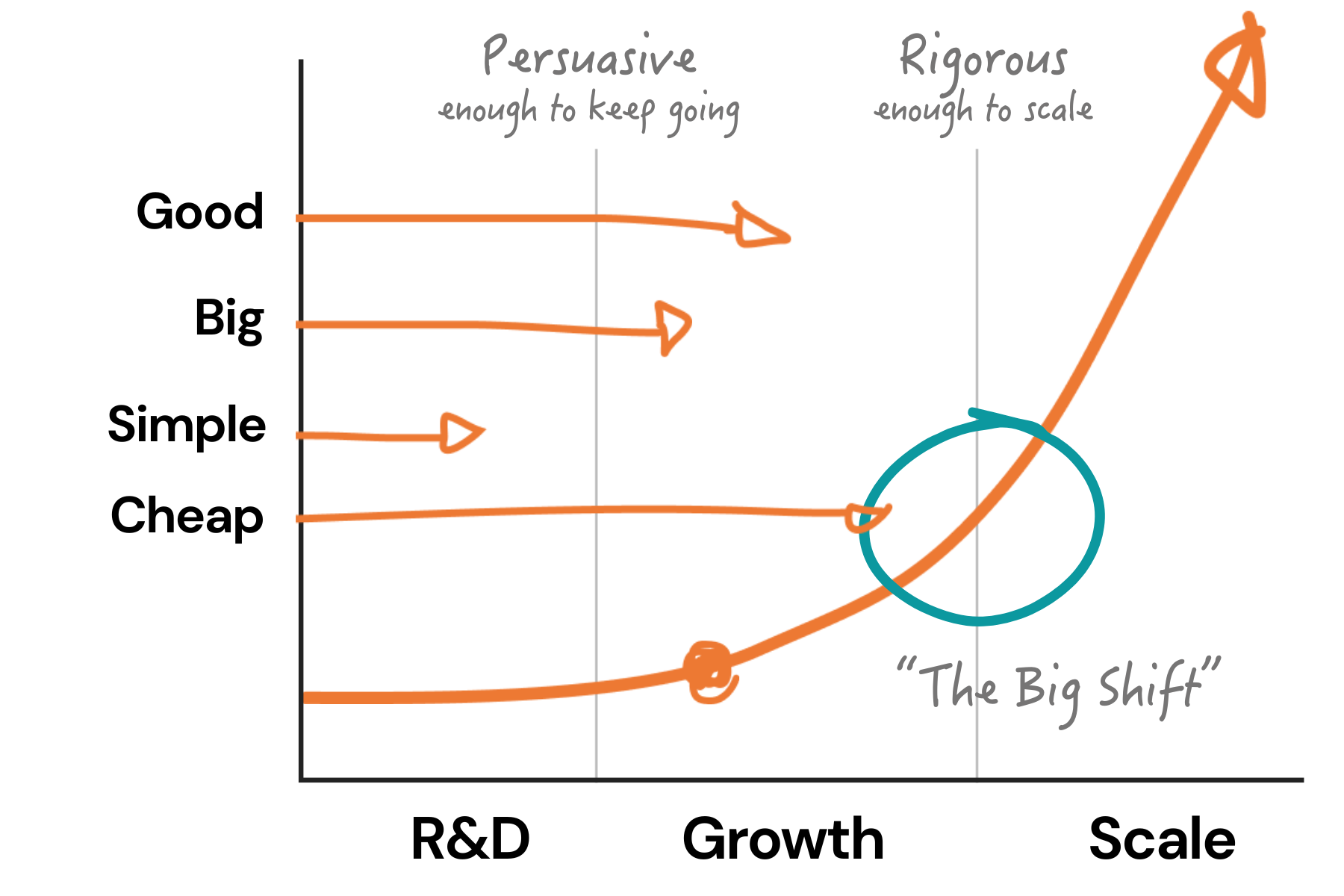 Mulago uses four criteria to gauge potential for exponential impact. The model must be: