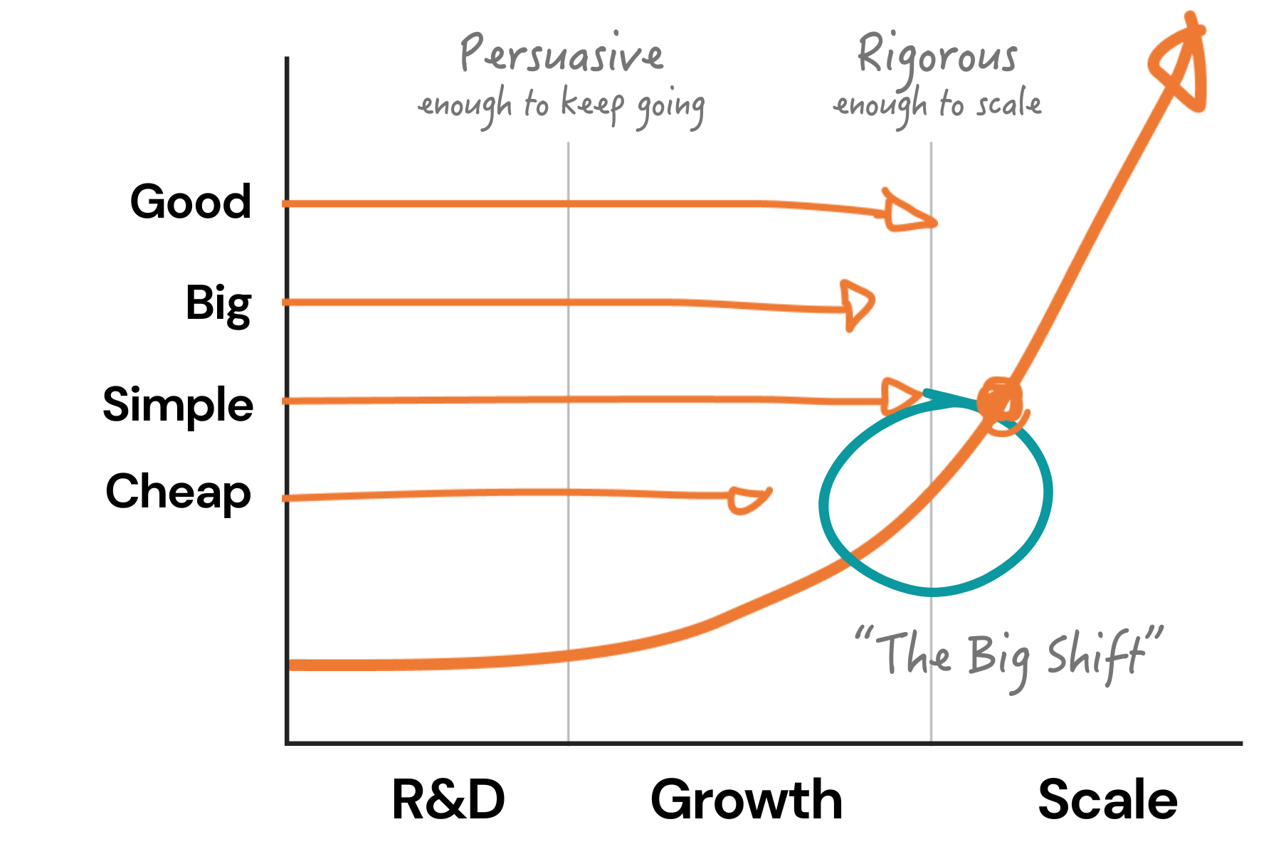 Mulago uses four criteria to gauge potential for exponential impact. The model must be: